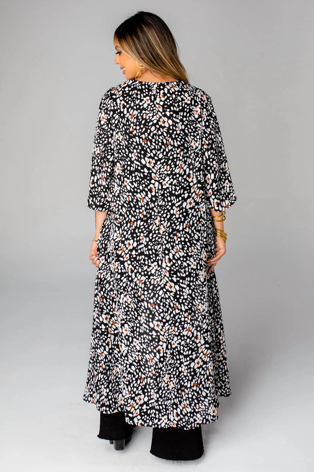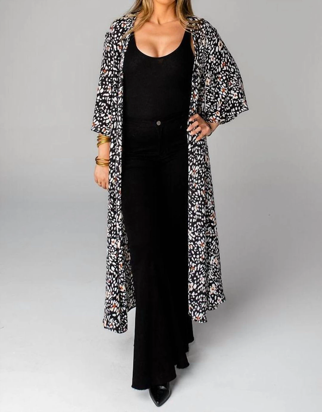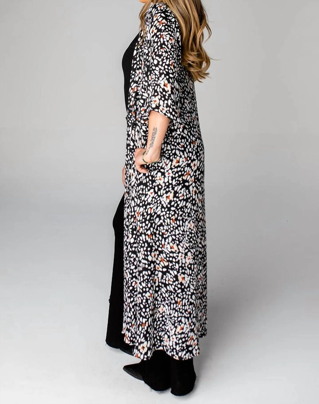 The Alix is a floor length duster with elbow length sleeves and is perfect paired with a tank top, skinny jeans, and booties!Product Details – Fit – รย Theรย Alixรย Duster fits true to sizeLength – รย Maxi Length. Size S/M measures 54″ from shoulder to hem.Bust – รย The bust is open andรย accommodates all sizesรย Waist – รย Relaxed fitHips – รย Relaxed fitFabric – รย Contains no stretchรย