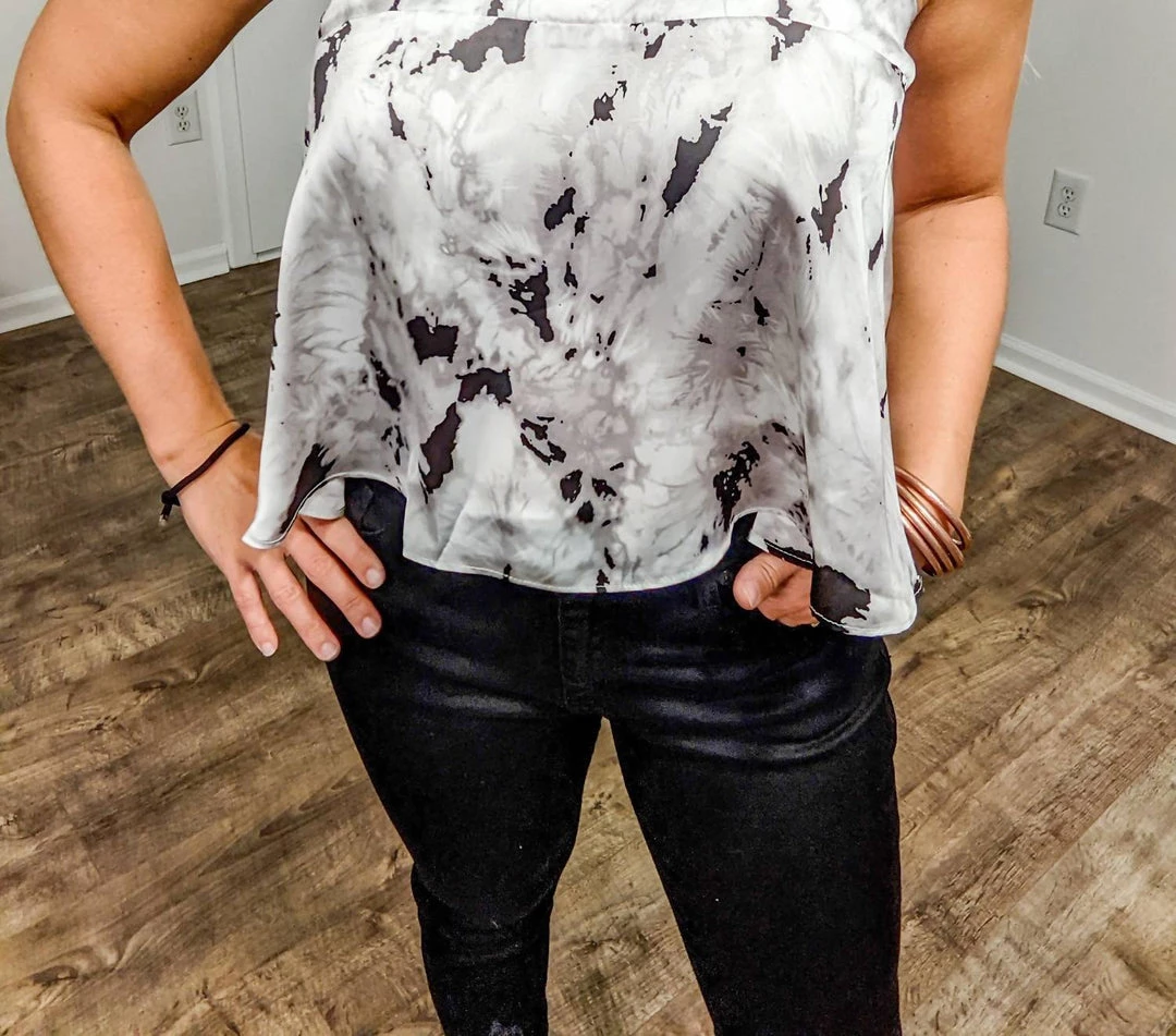 It doesn’t get any classier than this silky, marble print top. The Athena Top is so soft and lightweight. Marble print throughout & a square neckline. The straps are not adjustable so keep that in mind. We love this top paired with our Back in Black skinnies. Fits true to size!Fabric Care – Wash Cold, Hang DryModel Info – Height 5’1, Bra Size 34 C, Wearing Size Small