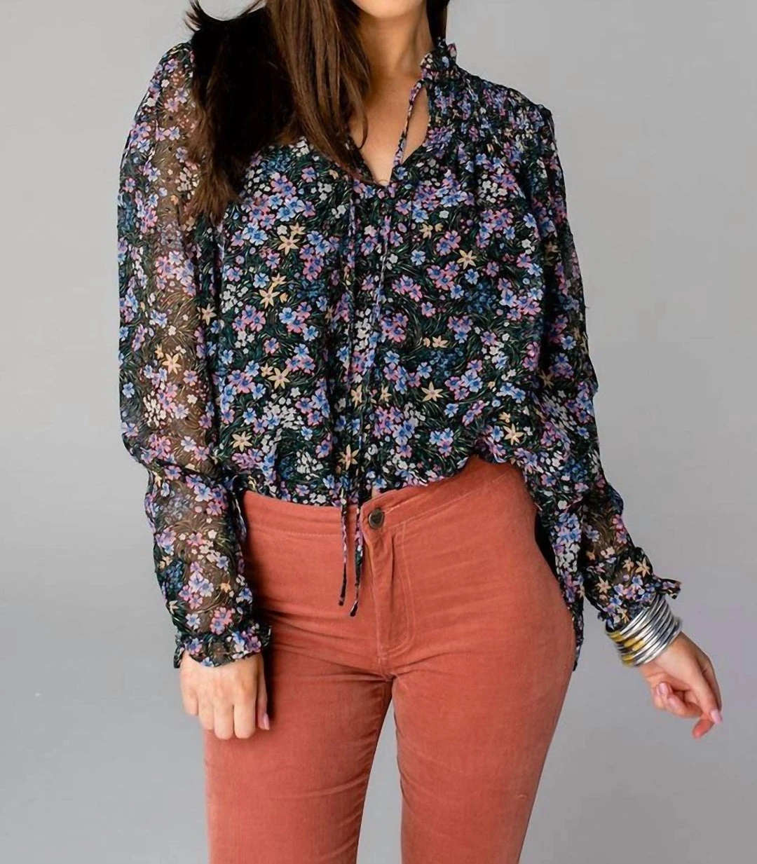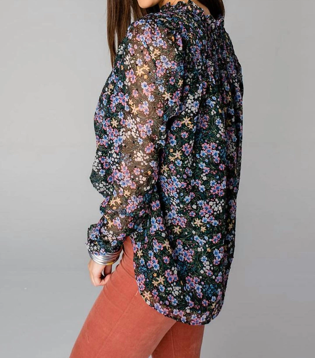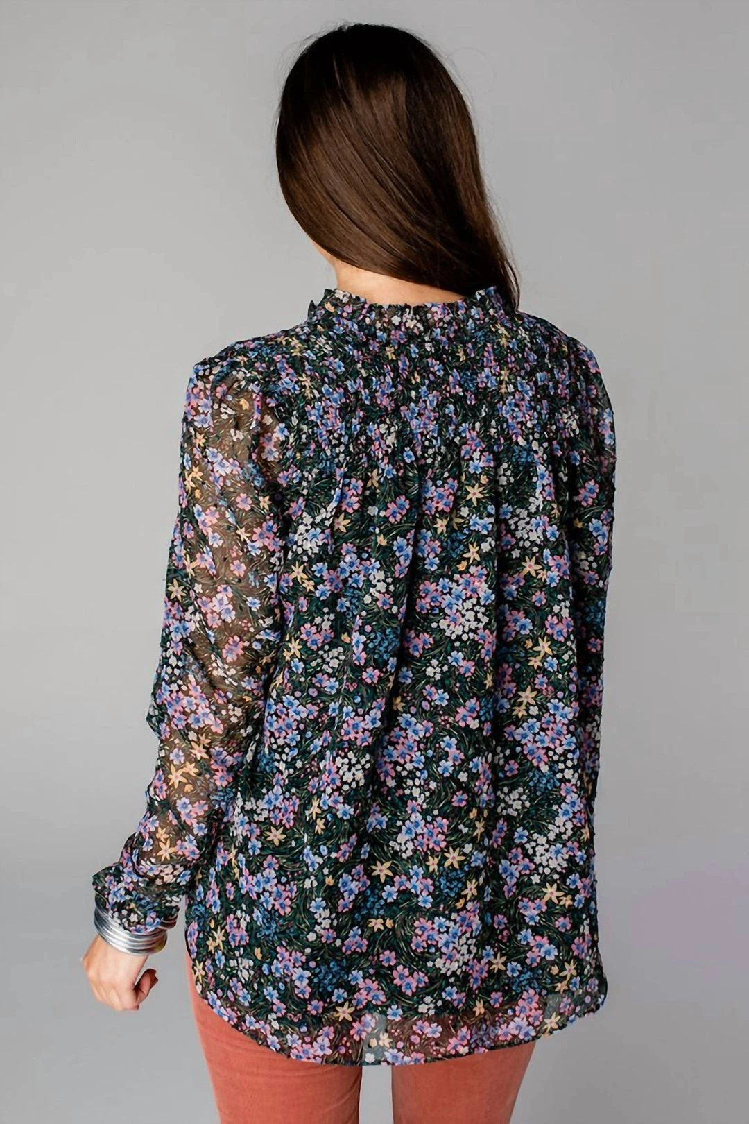 Features button down closure, tassels for extra closure, smocking on shoulders for extra room, long sleeves with an elastic trim, and fully lined.Fit – The Everly Blouse runs true to size.Length – The small measures to be 25″ long.รย Bust – Relaxed fitรย Waist – Relaxed fitFabric – Fabric contains no stretch.