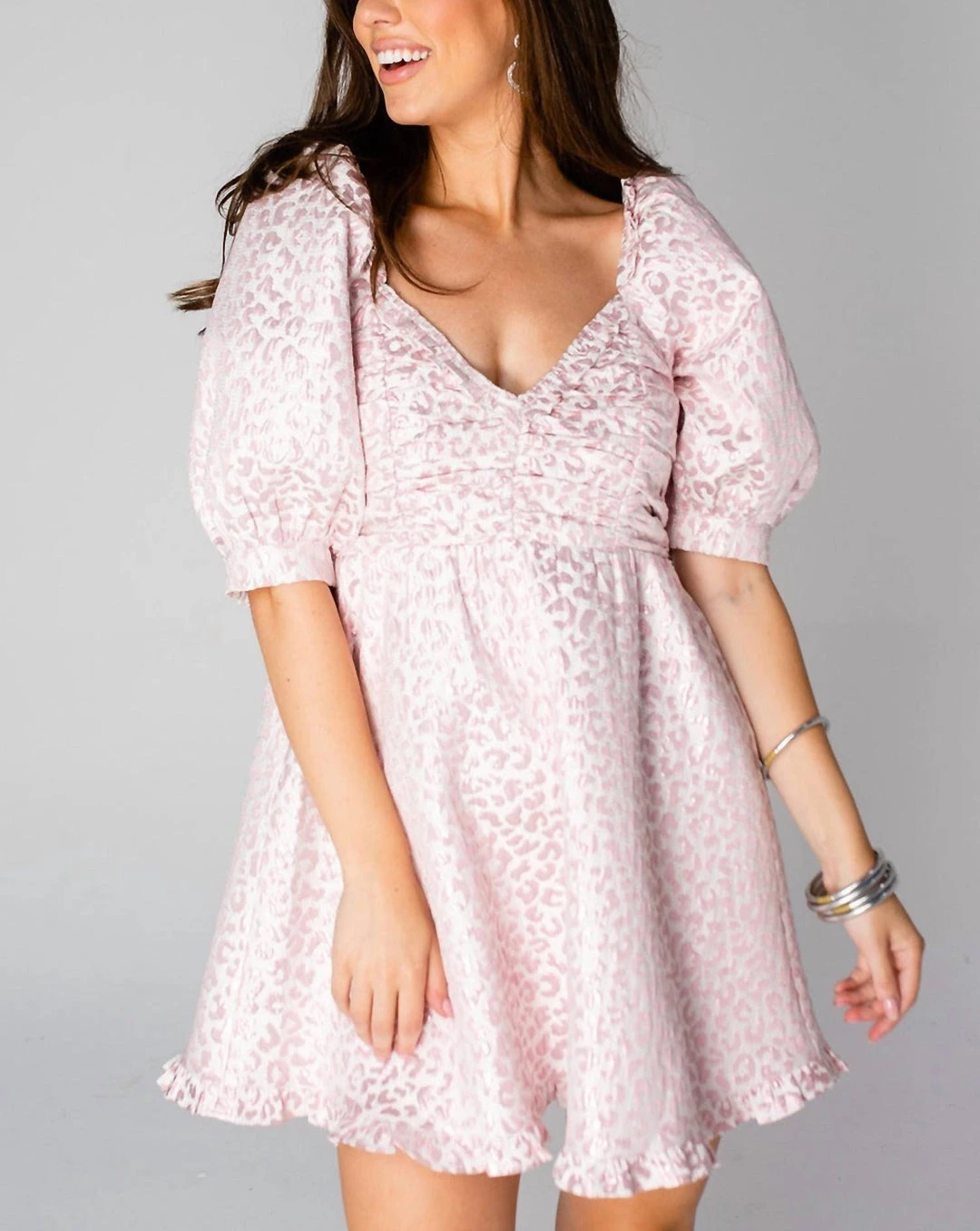 Featuring cuffed puff short sleeves, v cut neckline with ruching throughout the bodice, and a-line skirt with adorable ruffle hem.