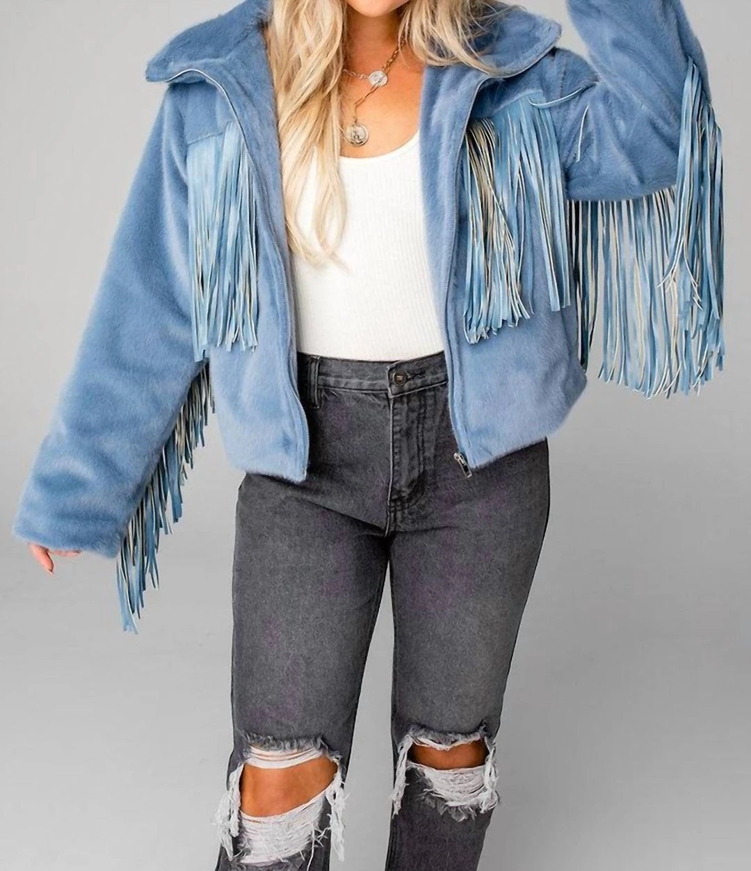 Promo 🤩 Buddylove 👩 women Skylar Fringe Faux Fur Jacket in Light Blue 💯