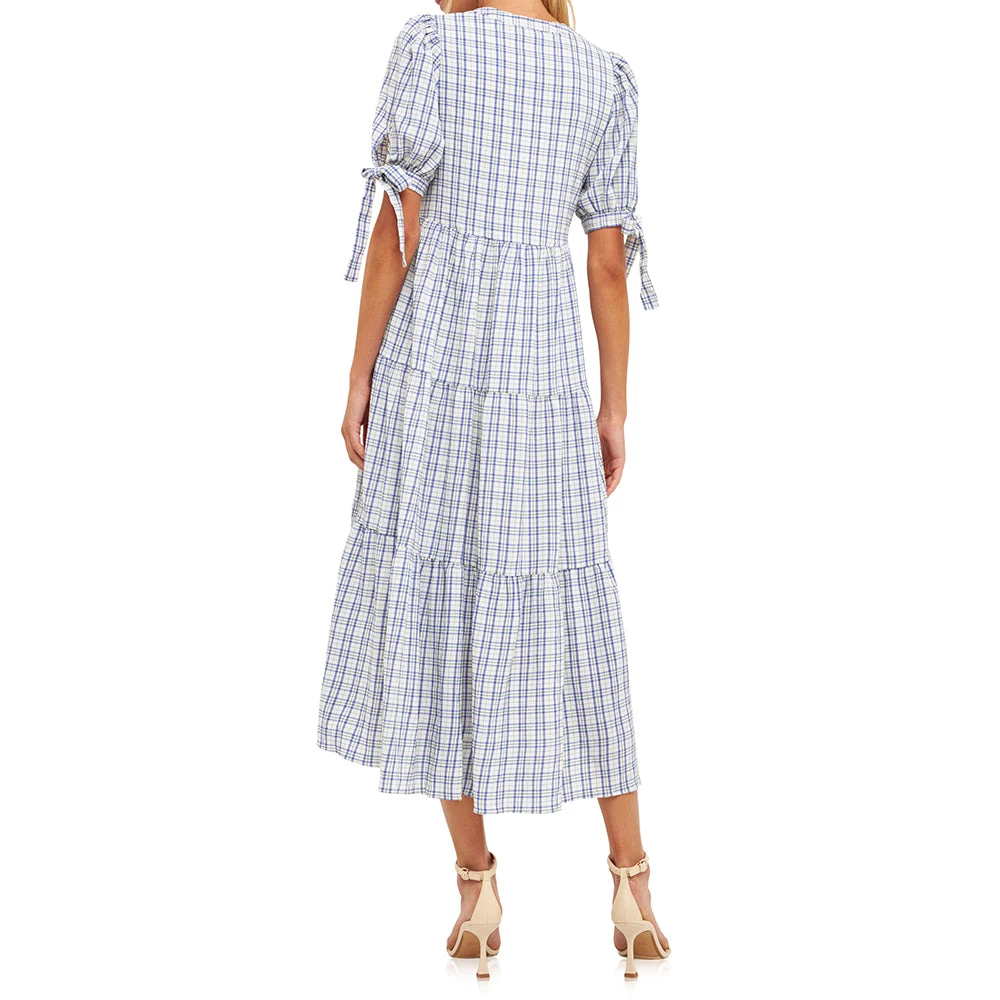 New ⭐ ENGLISH FACTORY 👩 women Gingham Tiered 👗 Dress with Bow-Tie Sleeves 👍