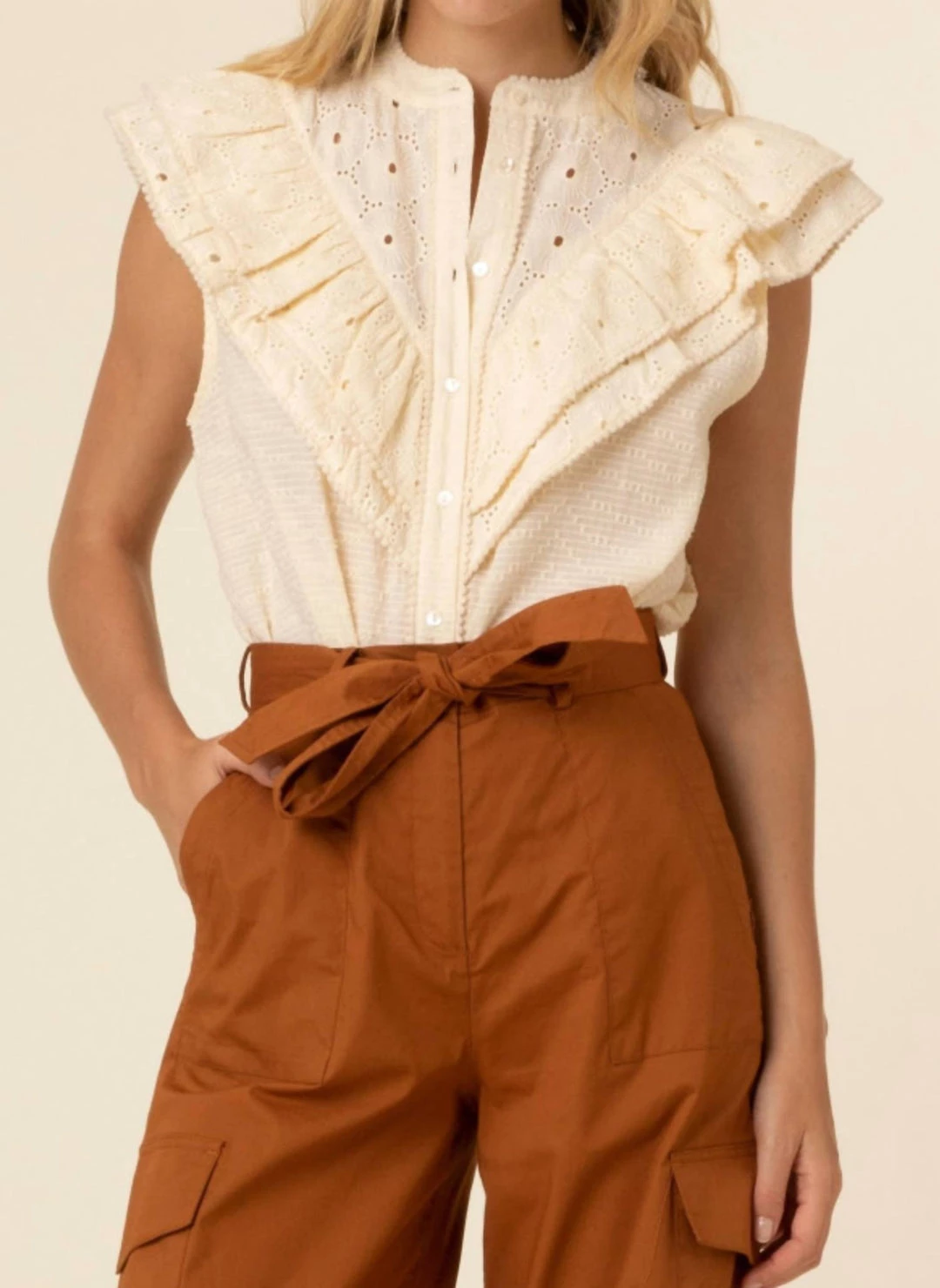 Textured fabric blouse with English embroidery. Mao collar, ruffles and front button fastening.