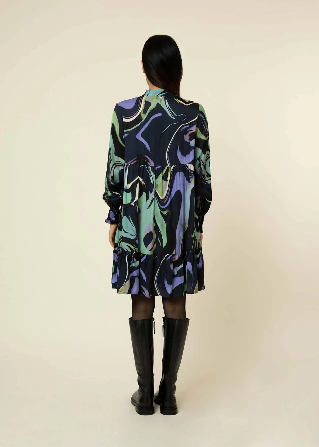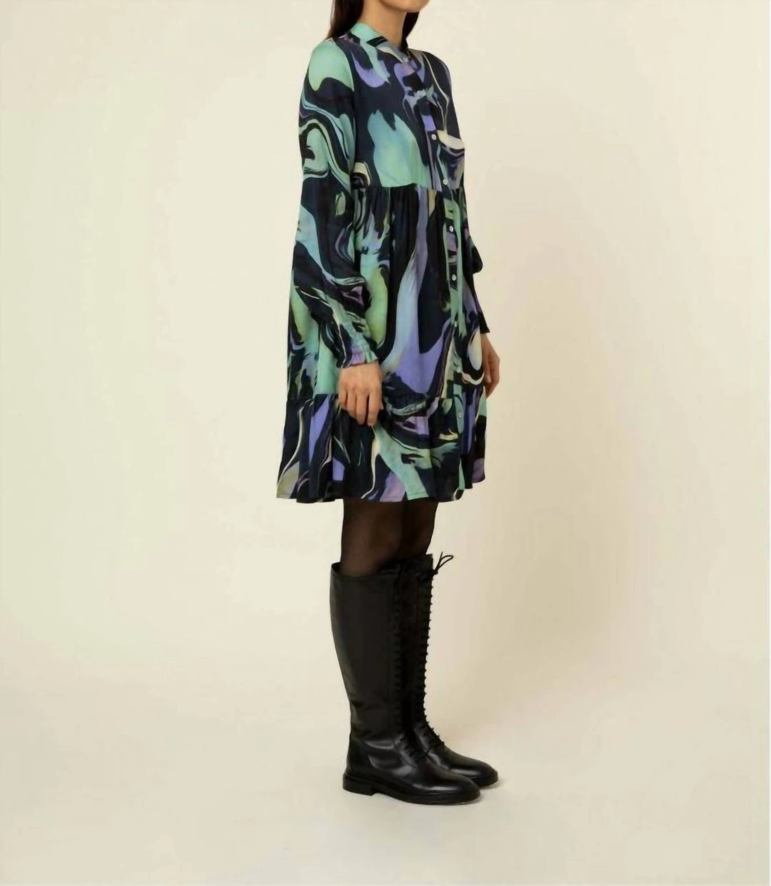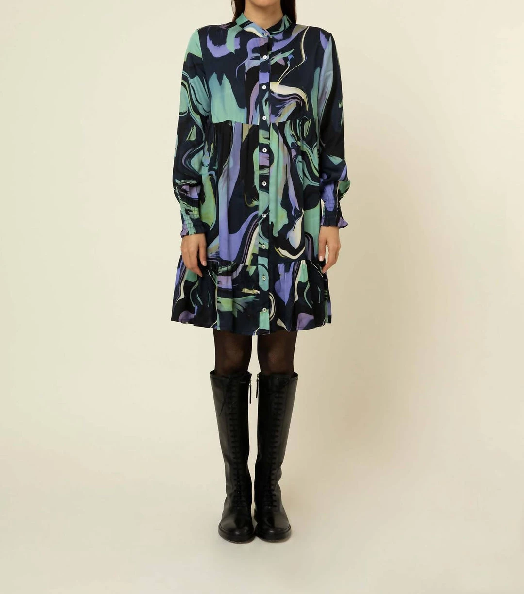 – Short dress with long sleeves- Ruffled sleeves- Front button placket- Round neckline
