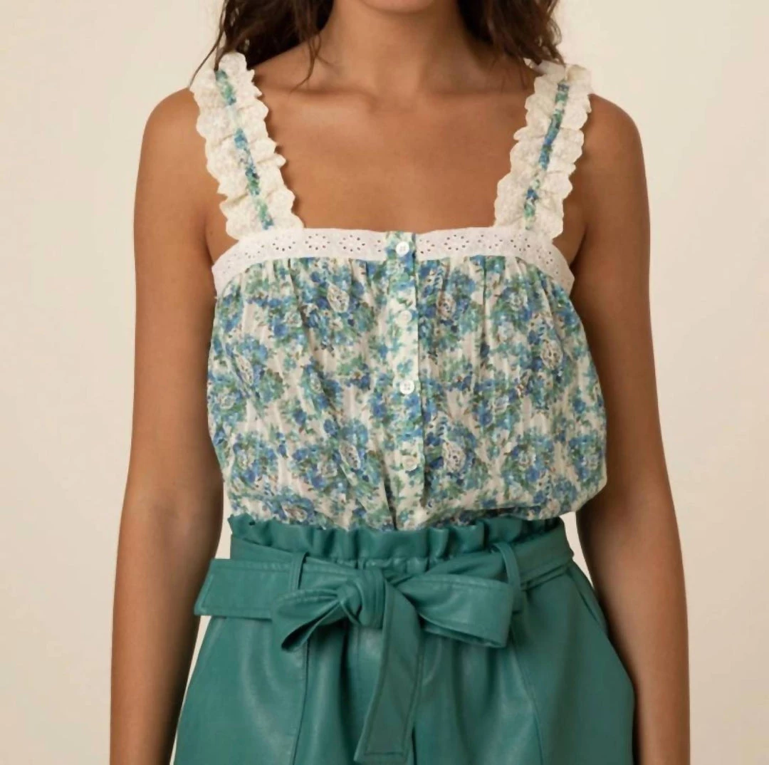 Blue and Green floral tank with lace detailed straps. Straps are adjustable. Slightly cropped length.ΓΒ