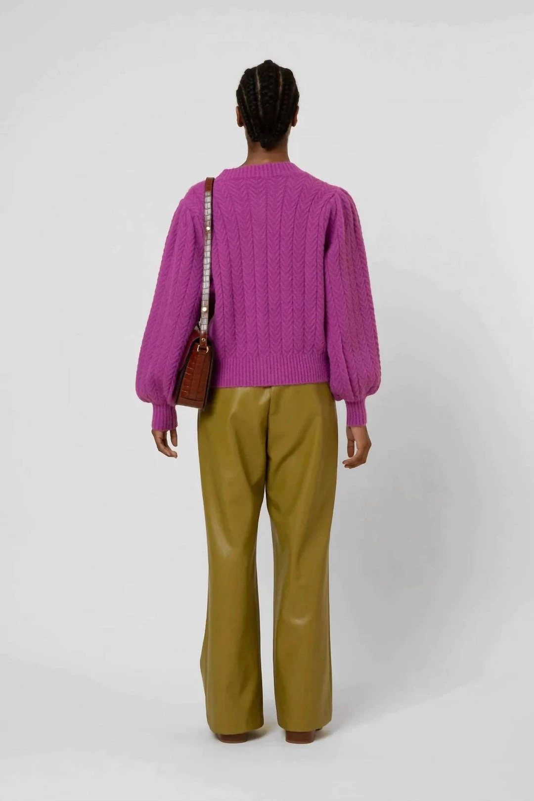 This chunky knit sweater is the perfect cardigan. It’s a soft magenta to compliment your fall wardrobe. Throw it over a graphic tee, jeans and tall boots, or wear it with a floral skirt, nice blouse and flats. Features button down, herringbone knit, balloon sleeves and ribbed trim.Pictured with the Kamela Floral Midi Dress.Sizing – รย Small – sizesรย 0-6Medium – sizesรย 6-10รย Large – sizes 10-14Model is 5’5″, a typical size 6/28 jean and is wearing the Vanille Herringbone Cardigan in a size small.รย Fabric Content – รย 55% Acrylic, 28% Polyester, 10% Wool, 5% Polyamide, 2% Elastane.รย Care Directions – รย Hand wash only in cold water and hang to dry.รย