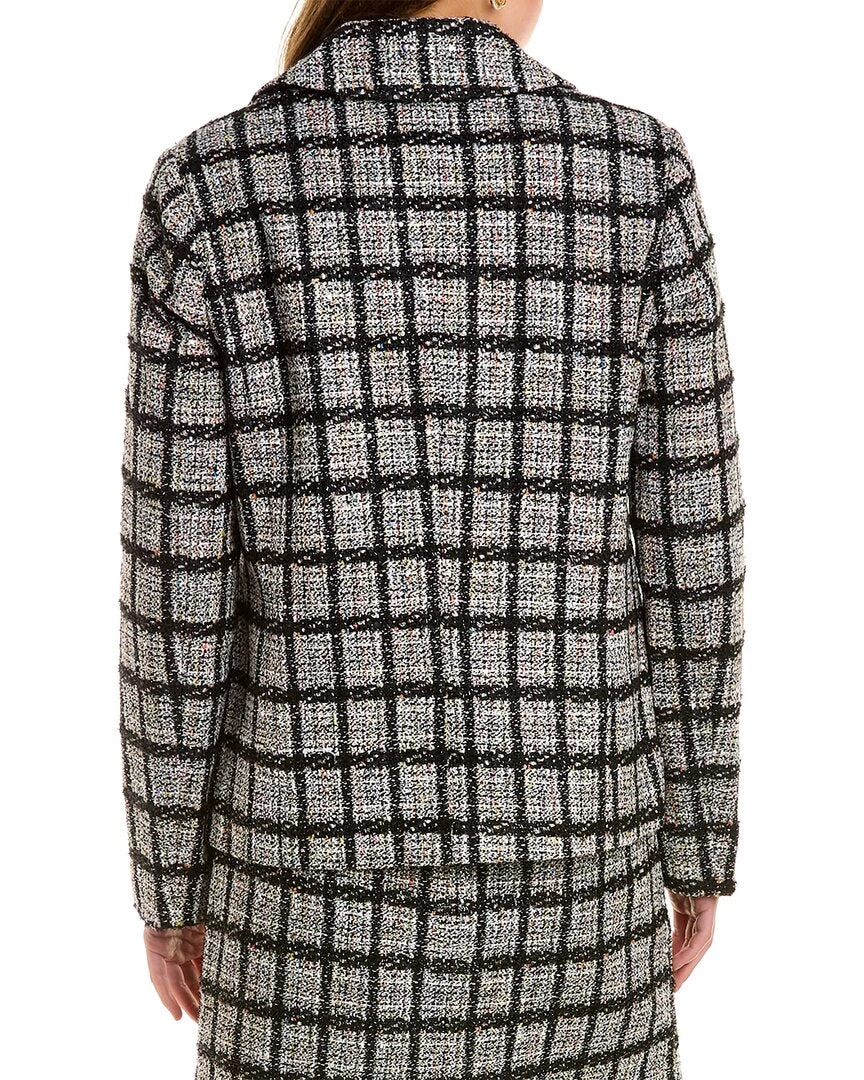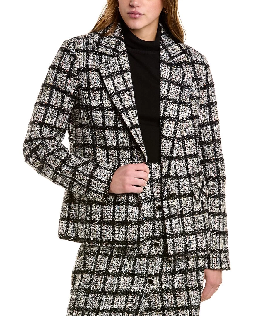 - Boxy Fit Blazer In Black Confetti With Tweed Construction, Metallic Threading, Notched Lapel, Two Front Button-Through Flap Pockets And Center Vent At Back Hem