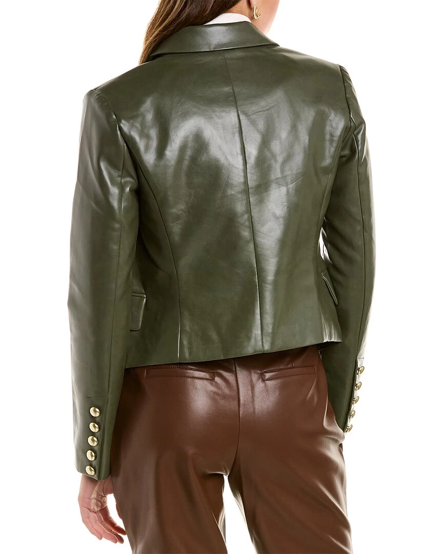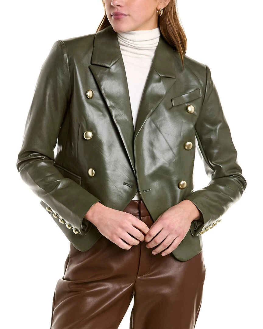 - Double-Breasted Blazer In Winter Olive With Faux Leather Construction, Notched Lapel, Left Chest Pocket, Dual Front Flap Pockets And Faux Button Accents At Cuffs