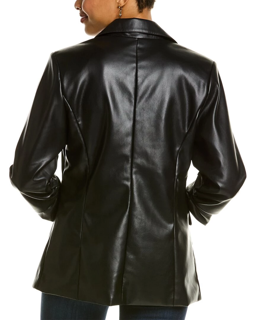 - Scrunched Sleeve Blazer In Black With Faux Leather Design, Notch Lapel, And Two Front Pockets